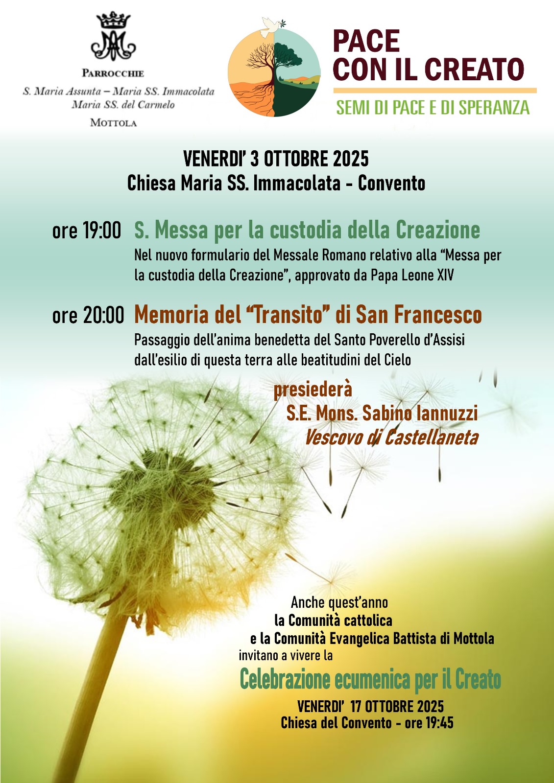 Con la partecipazione alla Messa per la custodia della Creazione onoriamo anche la memoria di san Francesco che ci diceva che la terra è la nostra casa comune, è la nostra madre e la nostra sorella. L’appuntamento è per venerdì 3 ottobre nella Chiesa del Convento, cui seguirà Memoria del “Transito” di San Francesco, presieduta dal nostro Vescovo. Per venerdì 17 ottobre appuntamento sempre nella Chiesa del Convento per la Celebrazione Ecumenica del Creato vissuta insieme alla comunità Evangelica Battista di Mottola.