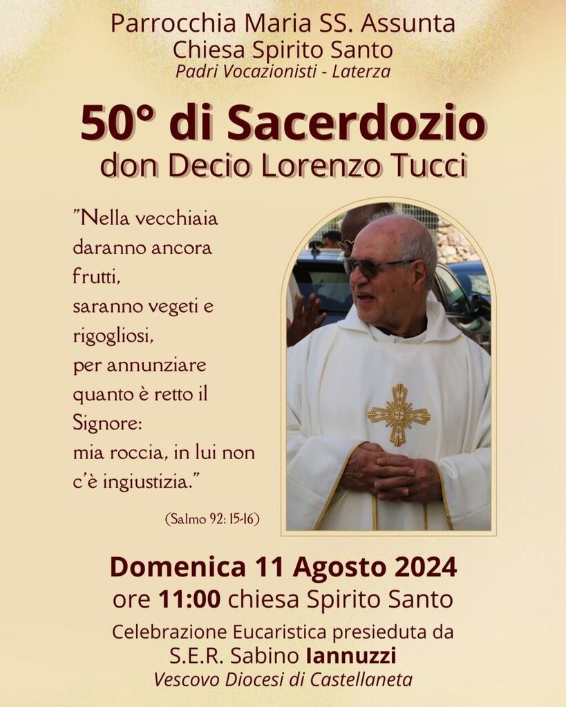 La comunità della Parrocchia Maria SS. Assunta di Laterza, insieme ai Padri Vocazionisti, si appresta a vivere il 50° anniversario di sacerdozio di don Decio Lorenzo Tucci.